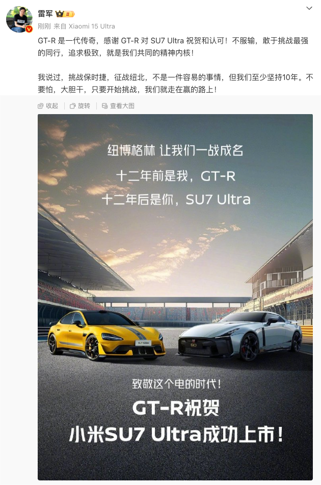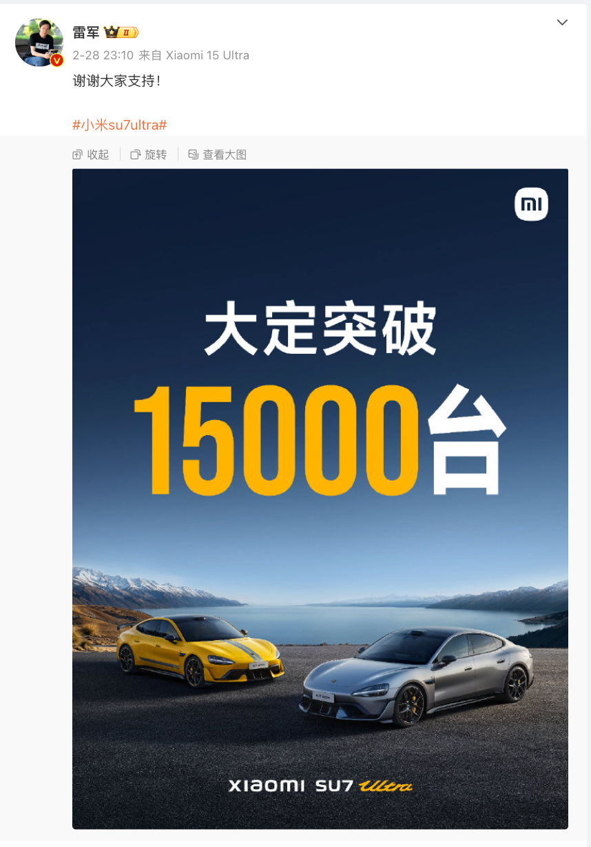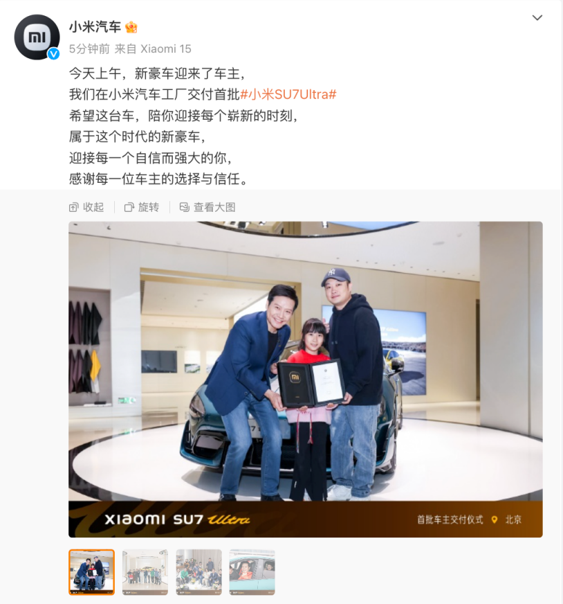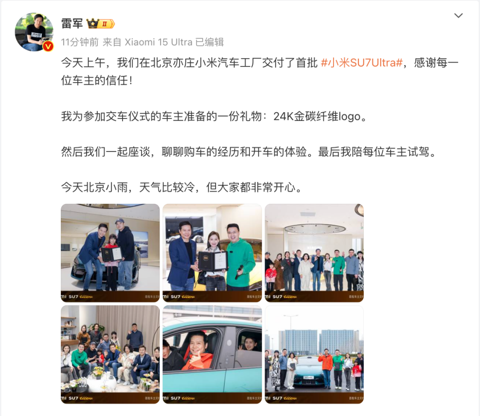 【导读】刚刚,欧博官网首俩小米SU7 Ultra交付!雷军送上24K金碳纤维LOGO,并陪每位车主试驾…… 中国基金报记者 忆山 3月2日早间,小米创办人、董事长兼CEO雷军在微博发文称,小米SU7 Ultra首车交付仪式将在上午10点举行。 雷军表示:“小米SU7 Ultra的订单远超预期,今天下午继续讨论提产问题。如果大家已决定购车,尽快锁单,我们将按锁单顺序排产。” 从网友发布的现场视频和照片来看,雷军在小米汽车工厂迎接了首批车主,与车主们握手、交谈,并为他们送上新车钥匙、合影留念。 雷军则在微博发文称:“今天上午,我们在北京亦庄小米汽车工厂交付了首批小米SU7 Ultra,感谢每一位车主的信任!我为参加交车仪式的车主准备了一份礼物:24K金碳纤维logo。然后我们一起座谈,聊聊购车的经历和开车的体验,最后我陪每位车主试驾。今天北京小雨,天气比较冷,但大家都非常开心。” 小米汽车也在微博公布了雷军和首批车主的部分合影照片,欧博并表示新豪车在今天上午迎来了车主,感谢每一位车主的选择与信任。 当日上午,雷军还发布了数条微博,除对小米SU7 Ultra碳纤维前舱盖进行说明、欢迎大家周末体验试驾外,还感谢了GT-R对小米SU7 Ultra的祝贺和认可,他表示:“不服输,敢于挑战最强的同行,追求极致,就是我们共同的精神内核!” 雷军称:“挑战保时捷,征战纽北,不是一件容易的事情,但我们至少坚持10年。不要怕,大胆干,只要开始挑战,我们就走在赢的路上!” 销售火爆,大定已突破1.5万台 2月26日上午,雷军曾发文称,小米SU7 Ultra产品力很强,团队信心十足,对于1万台的全年销量目标,已有九成把握。 2月27日晚间,小米SU7 Ultra正式发布。其中小米SU7 Ultra标准版售价为52.99万元,纽北限量版售价为81.49万元。 新车开售后迅速爆单,开售10分钟大定突破6900台,开售2小时大定突破10000台,提前达成全年目标。2月28日晚间,雷军发布的消息显示,小米SU7 Ultra大定已突破15000台。 3月2日晚上8点,雷军还将举行直播,聊聊新豪车的思路和想法。 此前,雷军曾表示,全球汽车工业发展至今已有100多年历史,涌现了很多传奇的故事和名字。如今一个全新的时代已经来临,相信小米正在书写新的传奇。小米SU7 Ultra就是他们为这个时代打造的新豪车。 雷军还称,小米的使命是哪怕做豪车,也要让喜欢这辆车的人真正买得起。 此外,小米SU7销售也十分火爆,数据显示,截至2024年底,小米SU7上市仅9个月,累计锁单量超24.8万台,累计交付量超13.5万台。今年2月,小米SU7交付量超20000台,已连续5个月交付量超2万台,目前累计交付量超18万台。 校对:乔伊 (责任编辑:) |