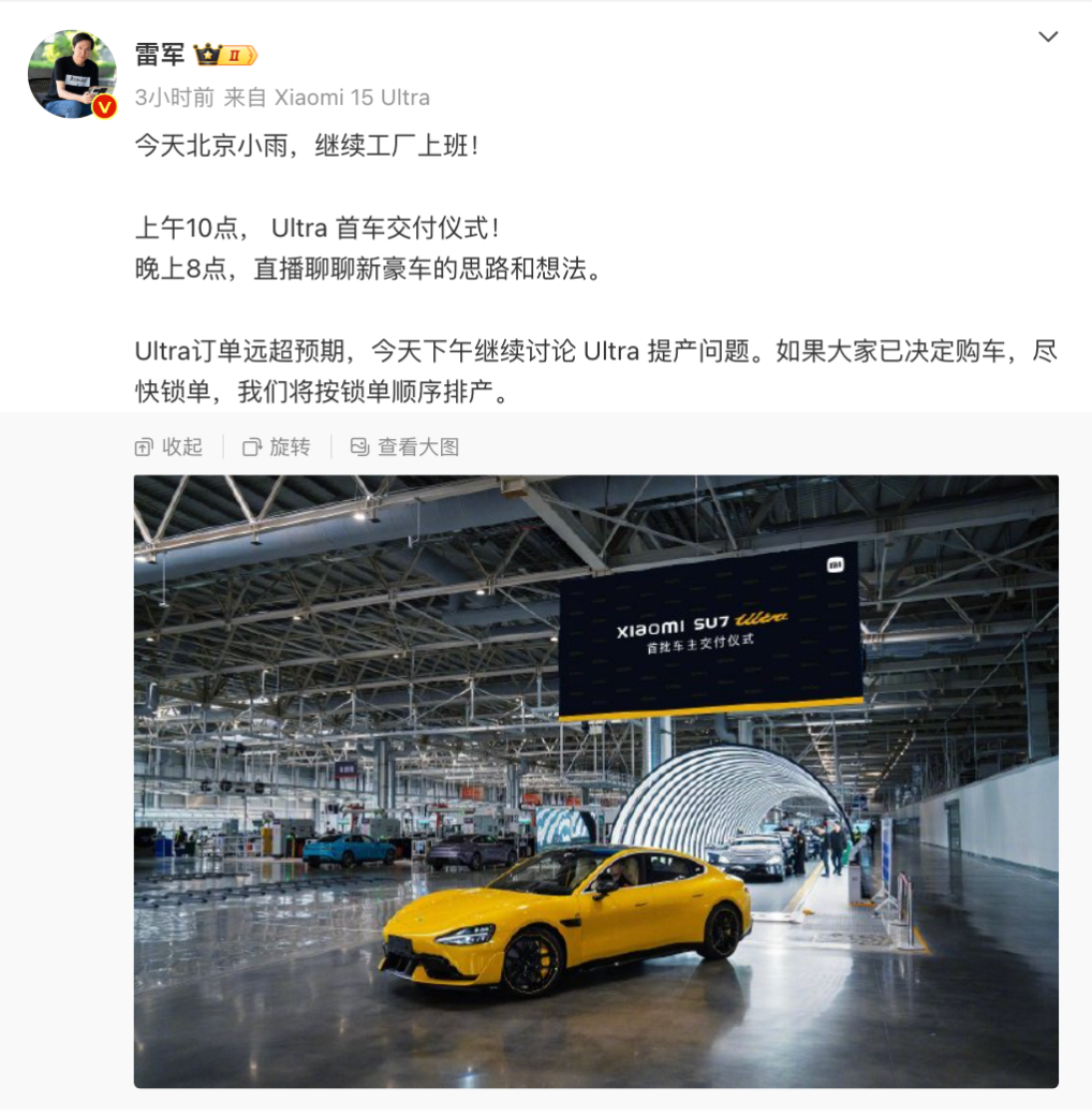 【导读】刚刚,首俩小米SU7 Ultra交付!雷军送上24K金碳纤维LOGO,并陪每位车主试驾……中国基金报记者 忆山3月2日早间,小米创办人、董事长兼CEO雷军在微博发文称,小米SU7 Ultra首车交付仪式将在上午10点举行。雷军表示:......